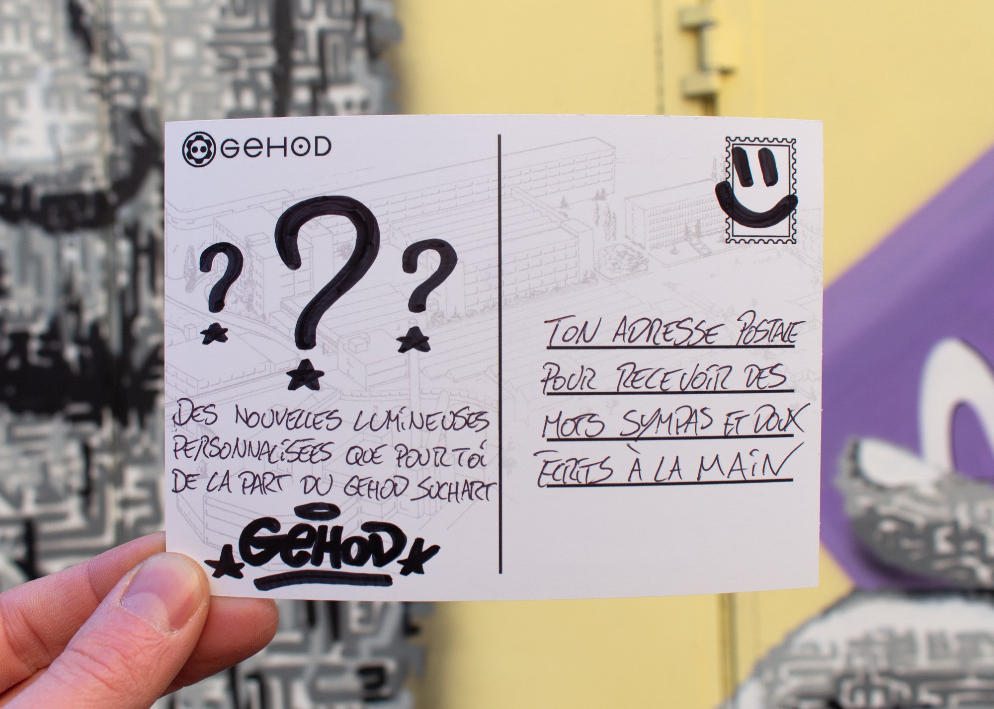 En hommage à l'histoire et en symbole de souvenir, ces cartes postales sont une invitation a recevoir un autographe artistique, un message personnalisé et sympathique. Elles sont porteuses de nouvelles lumineuses de la vie de l'usine Suchart et du quotidien de son gardien: GEHOD.